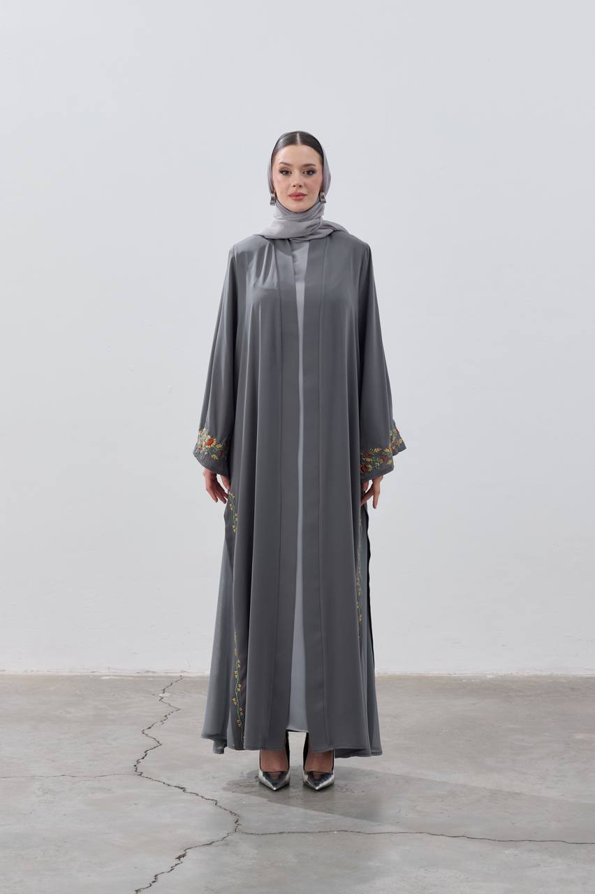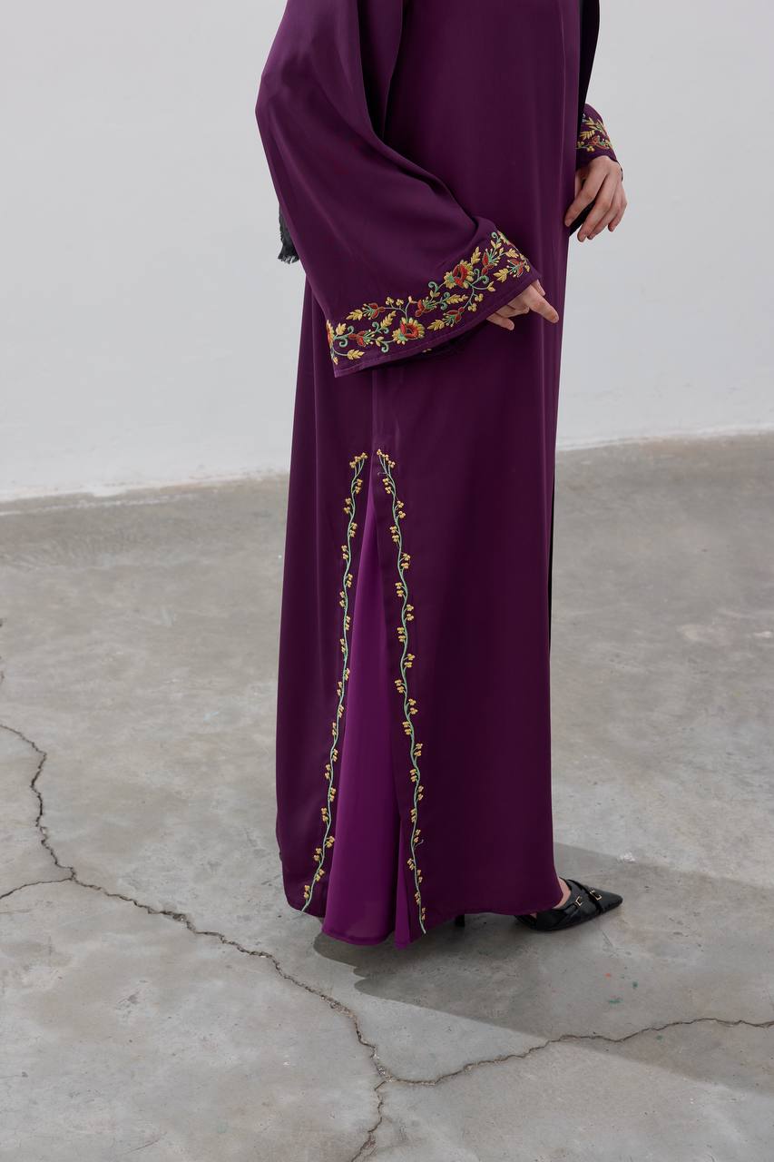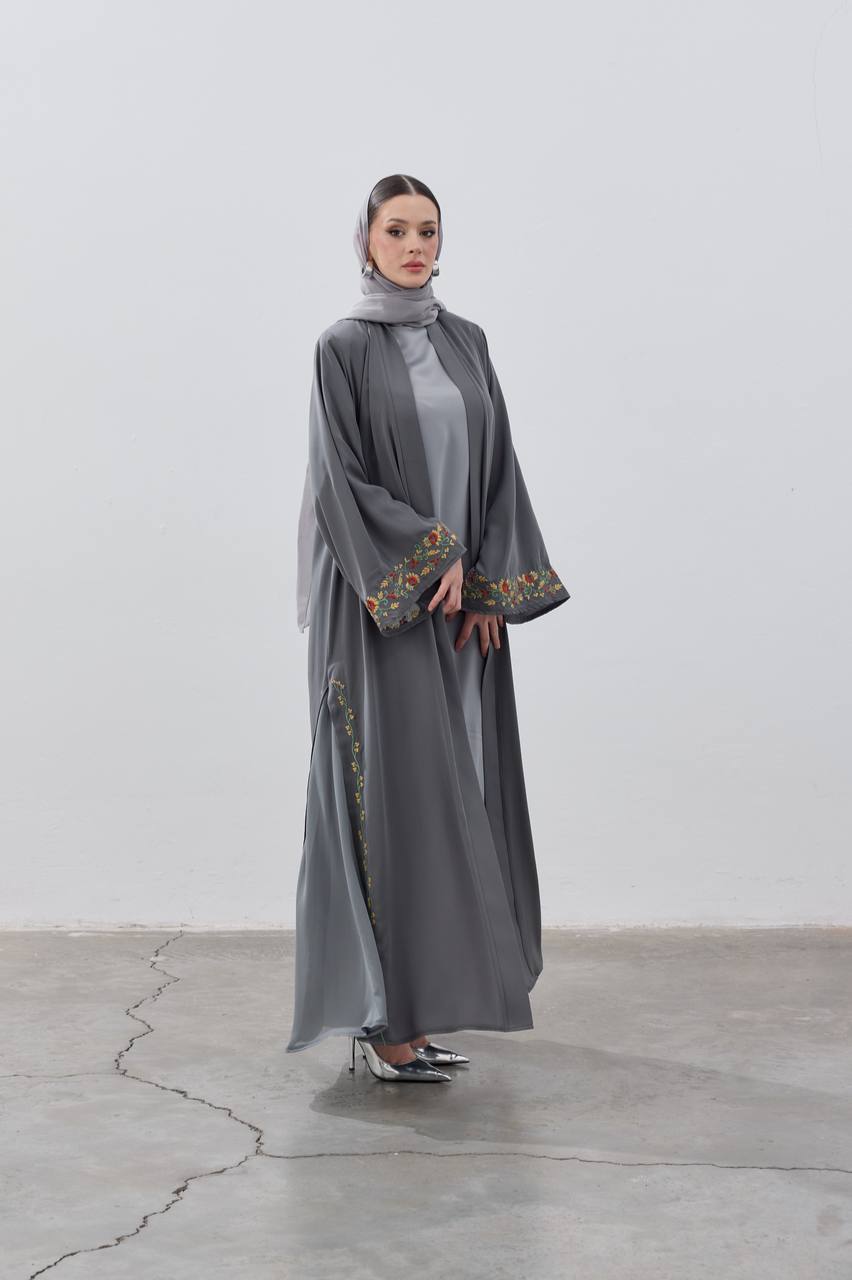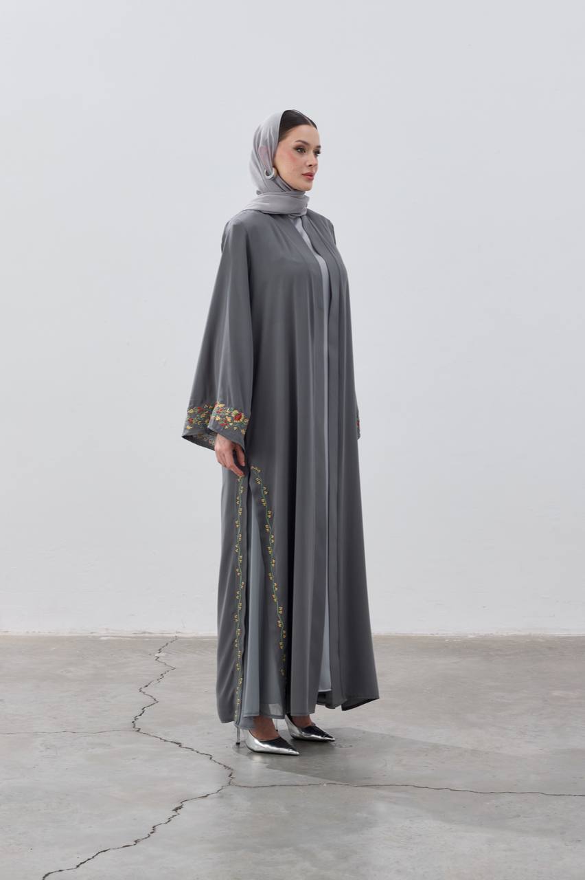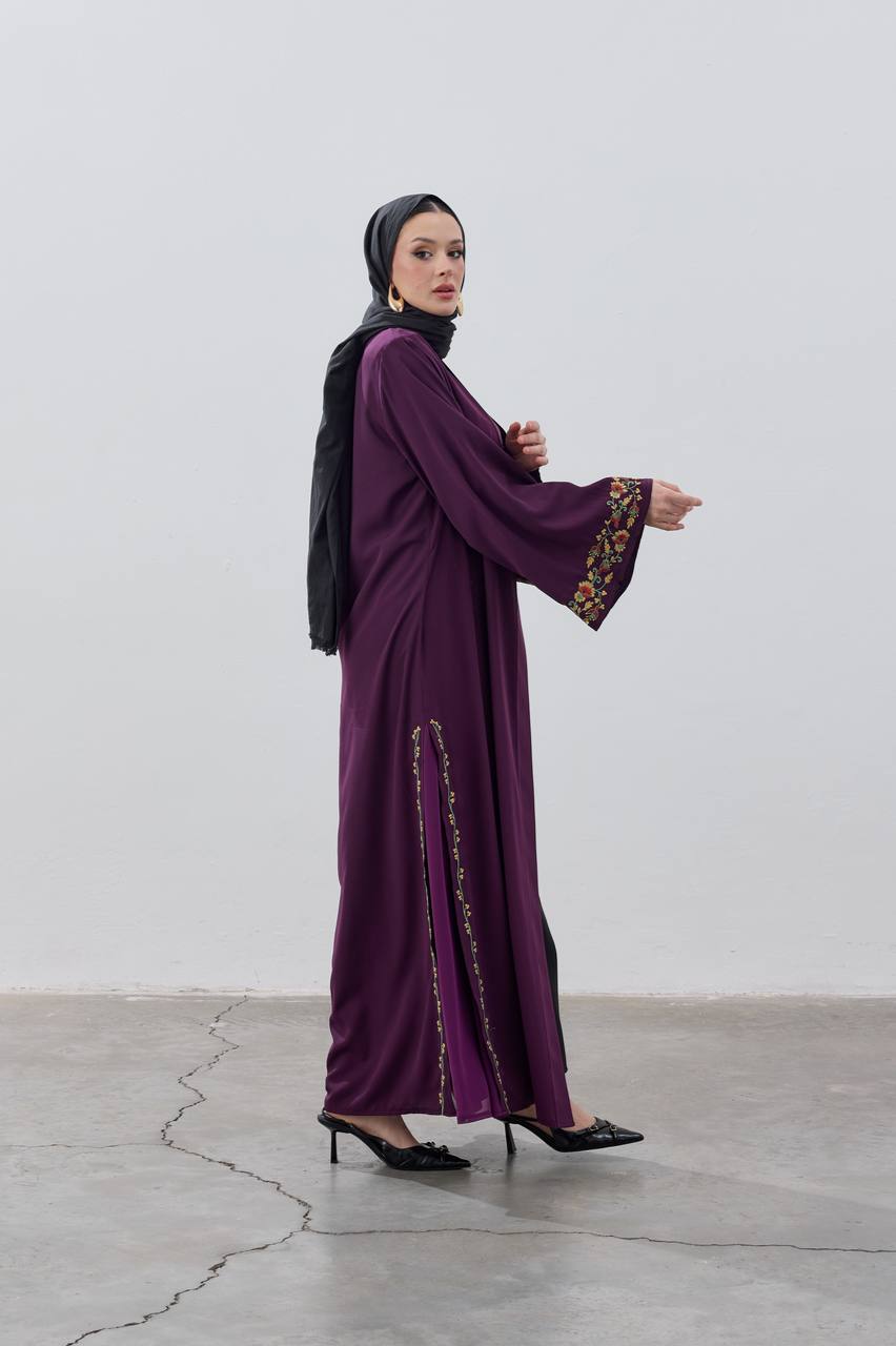 Elevate your elegance with the Yasmin abaya, featuring exquisite floral embroidery on the sleeves and sides that enhances its refined silhouette. Crafted with meticulous attention to every stitch, this limited edition piece offers exceptional quality for those who value artistry and detail in their wardrobe. Perfect for discerning individuals seeking timeless sophistication. One piece open abaya.
