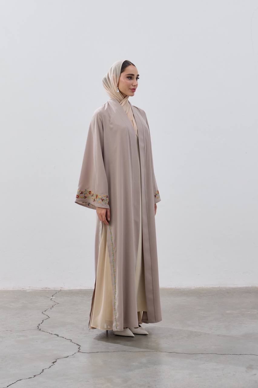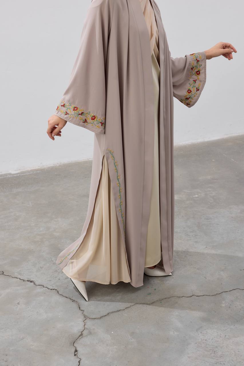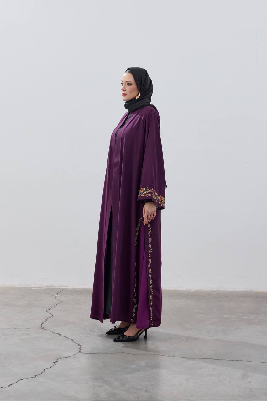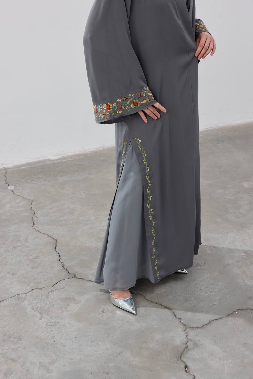 Elevate your elegance with the Yasmin abaya, featuring exquisite floral embroidery on the sleeves and sides that enhances its refined silhouette. Crafted with meticulous attention to every stitch, this limited edition piece offers exceptional quality for those who value artistry and detail in their wardrobe. Perfect for discerning individuals seeking timeless sophistication. One piece open abaya.